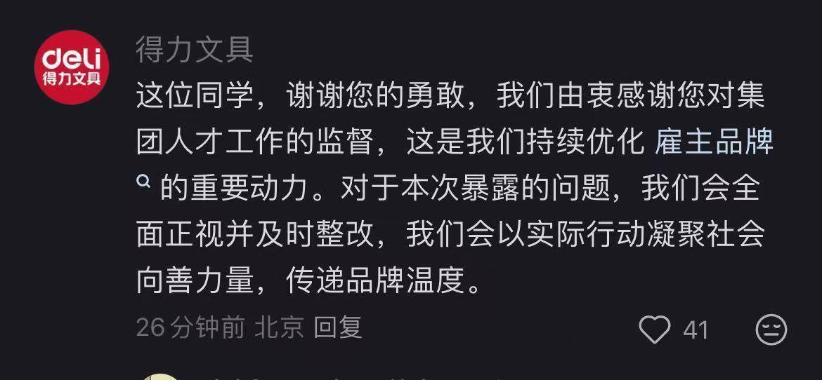 记者看到,得力文具在评论区留言:“这位同学,谢谢您的勇敢,我们由衷感谢您对集团人才工作的监督,这是我们持续优化雇主品牌的重要动力。对于本次暴露的问题,我们会全面正视并及时整改,我们会以实际行动凝聚社会向善力量,传递品牌温度。”