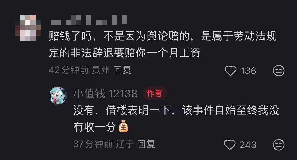 还有网友在评论区问有没有因非法辞退员工赔钱。当事人回复:“没有,该事件自始至终我没有收到一分钱。”