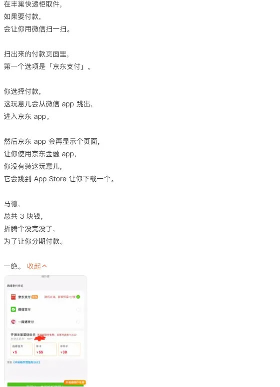 免费的互联网越来越魔幻了,还记得去年,小柴报道过一个案例,大概是有用户去快递柜取了个滞留件,然后神奇的一幕发生了。系统提示需要付款,扫完后发现推荐京东支付,点击支付,页面直接跳转到京东APP,然后京东APP提示让你使用京东金融,如果没下载京东金融,它就会直接跳转到应用商店,让你下一个。