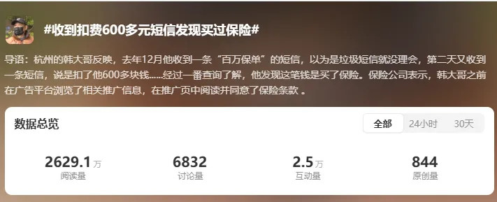 初看这个话题,以为是这个网友钱太多,到处买保险,忘了自己买过这个保险,但实际上是,他真不知道自己买过保险。据1818黄金眼报道,杭州一大爷上个月收到一条“百万保单”的短信,以为是垃圾短信就没理会。结果到了第二天,又收到一条短信,说是扣了他600多块钱....