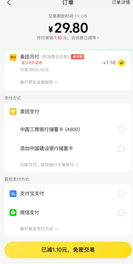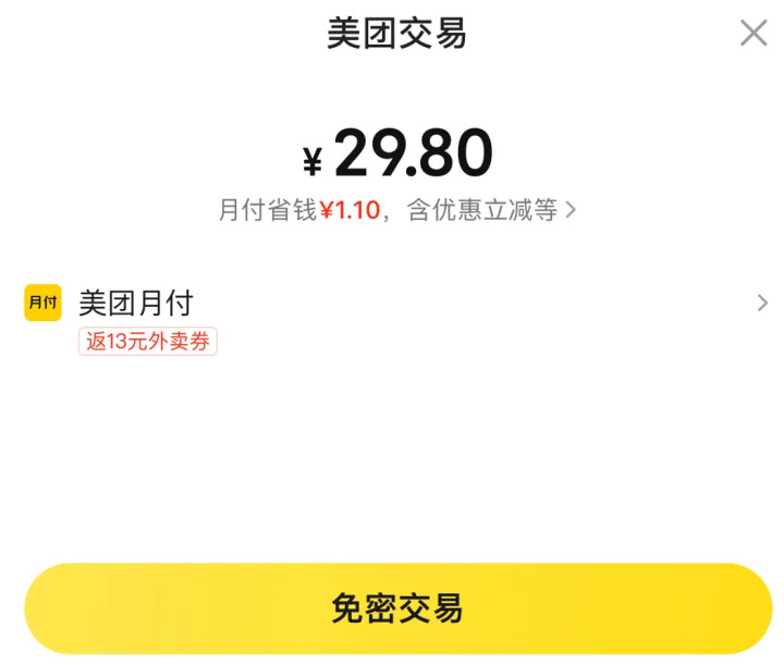 你终于选了普通支付,然后支付的弹窗,变成了免密交易,看好了,这里的支付方式,依然是美团月付,如果你一不小心,就完成了网贷点外卖。