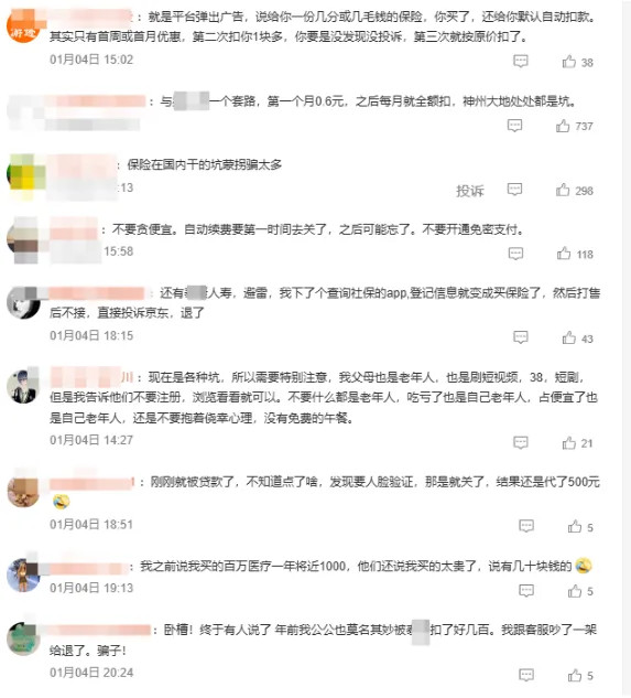 多半是这种被动办理保险的方式有点不正规,所以在用户发现被大额扣款,去保险公司讨说法的时候,保险公司都会很干净利落的退掉,而他们打的就是没察觉,也不会去退费的用户的主义,赚一个月是一个月。万一有理赔,大部分用户可能并不知道自己买过这个保险,或者被买的这个保险是否能理赔……就算真的去理赔了,这种险种也到处是坑,比如实际保障范围有限(如仅覆盖特定疾病)、单次理赔额度封顶(如1500元),或需满足苛刻条件。而这些被扣走的钱,最终都变成保险公司的利润,毕竟它们除了投广告,几乎没有其他成本了。对于这种互联网怪象,不少网友现身说法,称这是目前保险行业普遍性的套路,都在通过这种方式疯狂收割用户。有网友表示:就是平台弹出广告,说给你一份几分或几毛钱的保险,你买了,还给你默认自动扣款。其实只有首周或首月优惠,第二次扣你1块多,你要是没发现没投诉,第三次就按原价扣了。也有网友表示:“与**保一个套路,第一个月0.6元,之后每月就全额扣,处处都是坑”“终于有人说了 年前我公公也莫名其妙被**扣了好几百。我跟客服吵了一架 给退了”