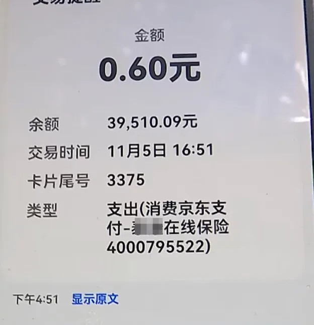 为啥这么轻易的退,还能给慰问金?他们为何这么做,心里在想什么,怕什么,大家都知道,但咱也不好说。然而,这位大爷并不缺这300块,表示要保留证据。大爷表示:“我没有主动要求去买,怎么会买了这个保险。”保险公司则表示,大爷之前在广告平台浏览了相关推广信息,在推广页中阅读并同意了保险条款,并填写了个人信息,开通了京东快捷支付。但大爷表示,现在手机里广告太多,老年人防不胜防。随后,查询短信发现,在这次六百多元的扣款之外,还有另外几次扣款,金额都非常小,其中有两笔为0.6元,客服解释称,0.6元一个是600万医疗险,另一个是重疾险,1.8元是百万防癌险。