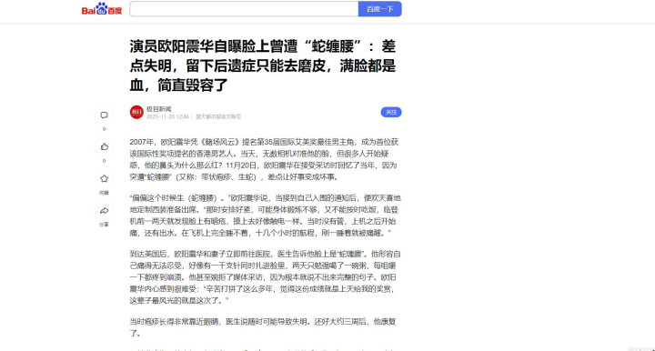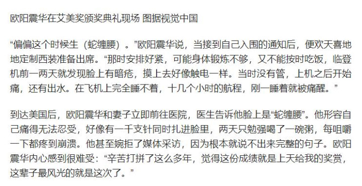 11月20日,有媒体爆料欧阳震华在采访中自爆曾患带状疱疹,也就是俗称的“蛇缠腰”。