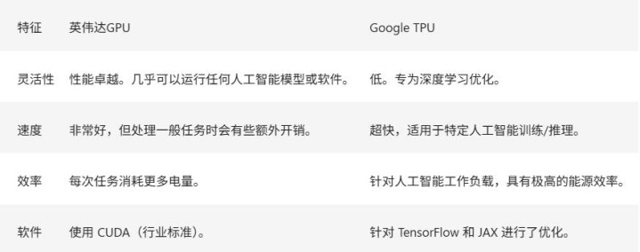 谷歌的TPU在推理(运行模型并得出答案)方面占据主导地位。由于TPU专为速度而设计,因此它们可以比GPU更快地同时为数百万用户提供AI“答案”,延迟更低。